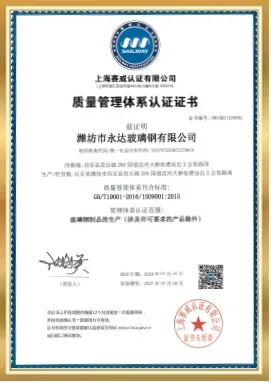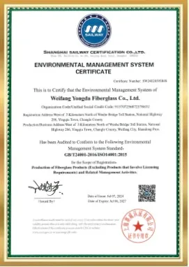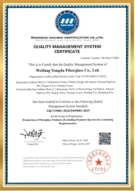 Weifang Yongda Fiberglass Reinforced Plastic Co., Ltd. was established in 2009 with a registered capital of 12 million yuan. It is located in Yingqiu Town, Changle County, Shandong Province, adjacent to National Highway 206, enjoying convenient transportation. The company covers an area of 15,000 square meters and has 16 years of rich experience in the production of fiberglass products. It is a modern enterprise integrating research and development, production, and sales. Professional production, quality guaranteed. The company focuses on the manufacturing of fiberglass reinforced plastic products (FRP), and its products cover: fiberglass reinforced plastic storage tanks, fiberglass pipes, fiberglass pipe fittings, fiberglass biological deodorization boxes, fiberglass covers, fiberglass cooling towers, fiberglass desulfurization towers, fiberglass absorption towers, integrated prefabricated pumping stations, integrated sewage treatment, etc. We have advanced production equipment and a professional technical team. We produce strictly in accordance with national standards to ensure the stable and reliable quality of our products. The company has passed the ISO9001 quality management system certification. Our products are sold throughout the country and exported to regions such as Southeast Asia, and are well received by customers.